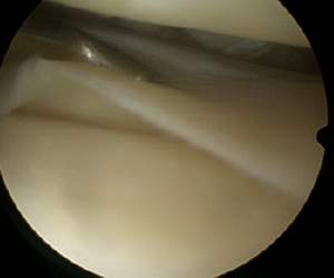 Arthroskopische Ansicht eines Meniskusrisses. Der Tasthaken ist der verlängerte Finger des Orthopäden und stellt den Riss dar.*